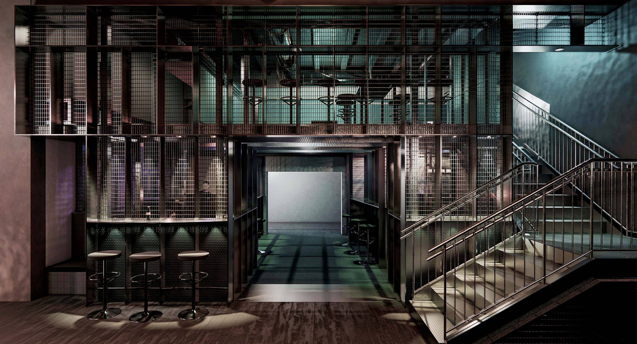 In a previously unused corner of Globus, a mezzanine takes shape. The upper level introduces a secondary bar, while the space beneath houses more intimate lounge areas. The modular steel façade frames the dancefloor and filters light and vision to extends its function beyond mere structure— integrating elements like lighting fixtures, high-top tables and seating niches.